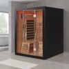 Infrarotkabine Helsinki 150 mit Dual-Technologie Du wünschst dir deine eigene kleine Wellness-Oase für Zuhause? Mit der Infrarotkabine Helsinki 150 geht dein Traum in Erfüllung. Eine Wärmekabine ist die ideale Alternative zu einer herkömmlichen Sauna. Die fünf eingebauten Vollspektrumstrahler erzeugen eine intensive Hitze, die Verspannungen im Rücken- und Wadenbereich besonders gut lösen kann. Vier weitere Flächenstrahler verteilen eine milde Wärme innerhalb der gesamten Kabine. Zahlreiche zusätzliche Gimmicks wie ein HiFi-System, Farblicht und ein digitales Bedienpanel bieten dir höchstmöglichen Komfort. Lehne dich entspannt zurück und lass den Alltag hinter dir.Hochwertiges Hemlockholz Für unsere Infrarotkabinen verwenden wir das helle Holz der Hemlocktanne. Die spezielle Holzart gibt die warme Infrarotstrahlung zurück und hält sie so innerhalb der Kabine. Zusammen mit der wasserabweisenden Eigenschaft des Tannenholzes schafft dies ein angenehmes Raumklima. Gesunde Infrarotwärme Die 5 Vollspektrumstrahler sorgen für eine intensive Hitze, die tief in deinen Körper eindringt. So können sich Verspannungen im Rücken- und Wadenbereich besonders gut lösen. 4 weitere Flächenstrahler verteilen eine milde Wärme innerhalb der gesamten Kabine. Bequeme Sitzmöglichkeiten Auf der integrierten Sitzbank und den beiden komfortablen Liegen finden 3 Personen bequem Platz. Mit einem Stellmaß von 150 x 150 cm bleibt die Infrarotkabine eine platzsparende Angelegenheit. Schaffe auch du dir deine eigene kleine Wellness-Oase für Zuhause. Stimmungsvolle Farblichttherapie Ein besonderes Highlight ist das stimmungsvolle LED-Farblicht in der Decke. Die bunten Lichter wechseln automatisch zwischen verschiedenen Farben und schaffen so die perfekte Wohlfühlatmosphäre.Eingebauter Ionisator für saubere Luft Bei dem eingebauten Ionisator handelt es sich um einen Luftreiniger, der mit seinen negativ geladenen Ionen die Luft in deiner Infrarotkabine reinigt. Gerüche, Staub, Keime und Schimmel werden zuverlässig aus der Luft beseitigt. Modernes HIFI-System Die Infrarotsauna ist mit einem modernen HIFI-System ausgestattet. Lehne dich zurück und lausche den Klängen deiner Lieblingsmusik. Das Radio verfügt über einen USB- sowie Bluetooth-Anschluss und 2 Lautsprecher.Praktisches Soft-Touch-Bedienpanel Dank des Soft-Touch-Bedienpanels lässt sich die Infrarotkabine kinderleicht bedienen. Mit wenigen Handgriffen stellst du Temperatur und Behandlungsdauer individuell auf deine Bedürfnisse ein. So kannst du dich bequem zurücklehnen und das Wärmebad genießen.Unkomplizierter Aufbau Die Lieferung erfolgt in bereits vormontierten Grundelementen, die du mit Hilfe des bewährten Klicksystems nur noch miteinander verbinden brauchst. So ist deine Kabine in ca. 30 Minuten aufgebaut. Angeschlossen an eine normale 230-Volt Steckdose ist die Kabine auch schon betriebsbereit