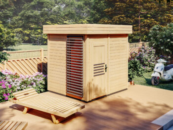 Fjordholz Saunahaus Modell Peetje 40 Die Außensauna Modell Peetje 40 bietet auf seinen knapp 5,00 m² eine Menge Platz und ist perfekt für kleinere Gärten oder Dachterassen geeignet.. Das Haus wird aus massiven 40 mm starken Wandbohlen mit einer modernen Eckverbindung hergestellt. Es kann wahlweise in natur oder bereits ab Werk lasiert bestellt werden. Die bereits ab Werk vorgefertigten 68 mm starken Dachelemente sind mit einer Isolierung aus Mineralwolle ausgestattet und bieten somit die perfekte Isolierung auch für kalte Wintermonate. Das große seitliche Fenster ist mit einem modernen Sichtschutzgitter ausgestattet bringt und bringt zugleich eine Menge Licht in den Sauna-Vorraum . Der geräumige Innenraum bietet mit seinen zwei hochwertigen Saunaliegen aus Lindenholz eine Menge Platz zum Saunieren. * massive 40 mm starke Wandbohlen mit Doppel-Nut-und Feder * massive 68 mm starke vorgefertigte Dachelemente inkl. Isolierung * extra starke Dachkonstruktion auch für höher